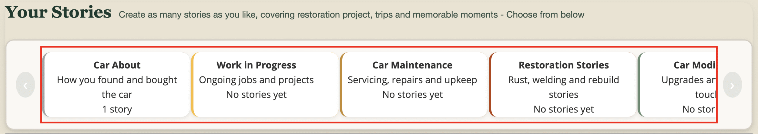 Car Albums have different Story Sections that you can pick and choose from, and are structured around story cards, so you can add content gradually, whenever it suits you. You can have as many story cars as you want within a section, or none at all, so if you have not undertaken any restoration work then simply don’t have the Restoration section