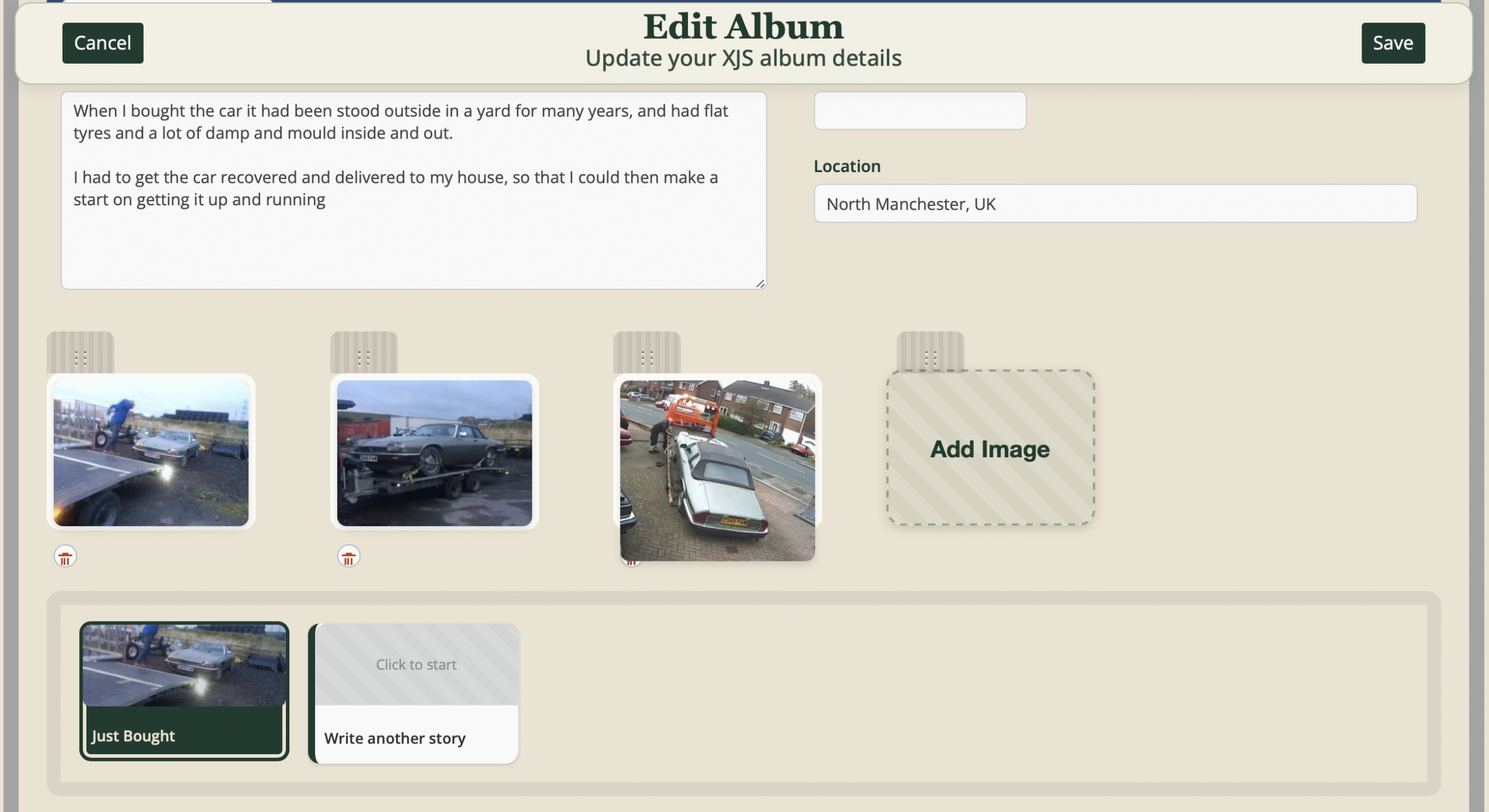 Each story card supports text and photos, presented cleanly and consistently, so the focus stays on the car — not the interface. Photo management is easy, you simply click on the “add image”, upload it from your phone or computer and that’s it.
